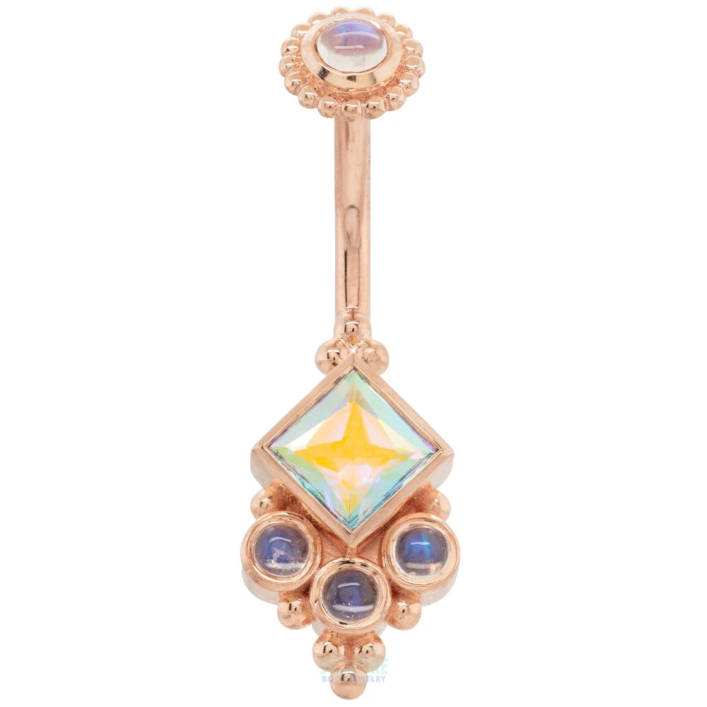 - 15mm x 9.2mm fixed bottom with (1) 5mm Princess-Cut Mercury Mist Topaz & (3) 2.5mm Rainbow Moonstone Cabochons in Bezel with bead accents & 6mm beaded “Raine” threaded top with (1) 3mm Round Rainbow Moonstone Cabochon with bead accents