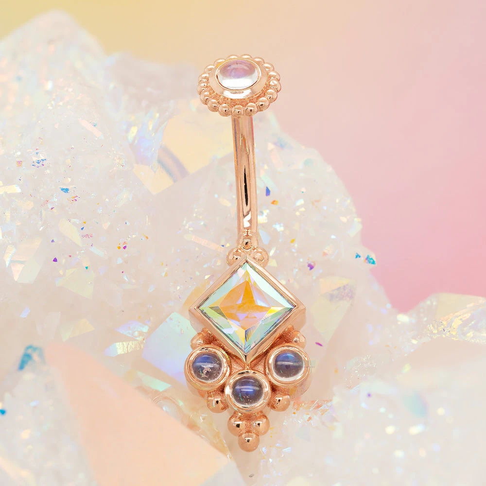 The “Sarai” and beaded “Raine” come together in this absolutely gorgeous navel curve! The Mercury Mist Topaz & Rainbow Moonstone offer all of the fabulous iridescent rainbow goodness you could possibly desire.