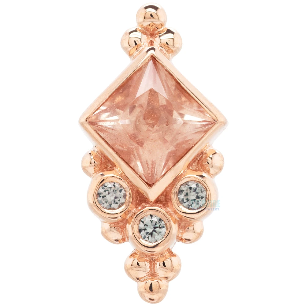 - 10mm x 4.5mm threaded end with (1) 3mm Princess-Cut Oregon Sunstone in Bezel & (3) 1mm Round Grey Sapphire AA in Bezels