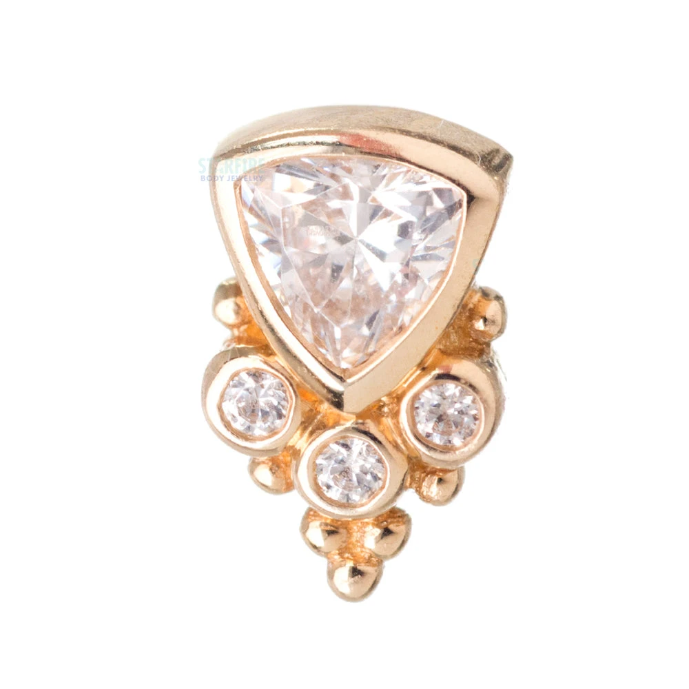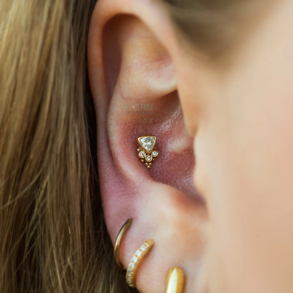 - 6.5mm x 4mm threaded end with (1) 3mm Trillion-Cut White CZ in Bezel & (3) 1mm Round White CZ’s in Bezel’s