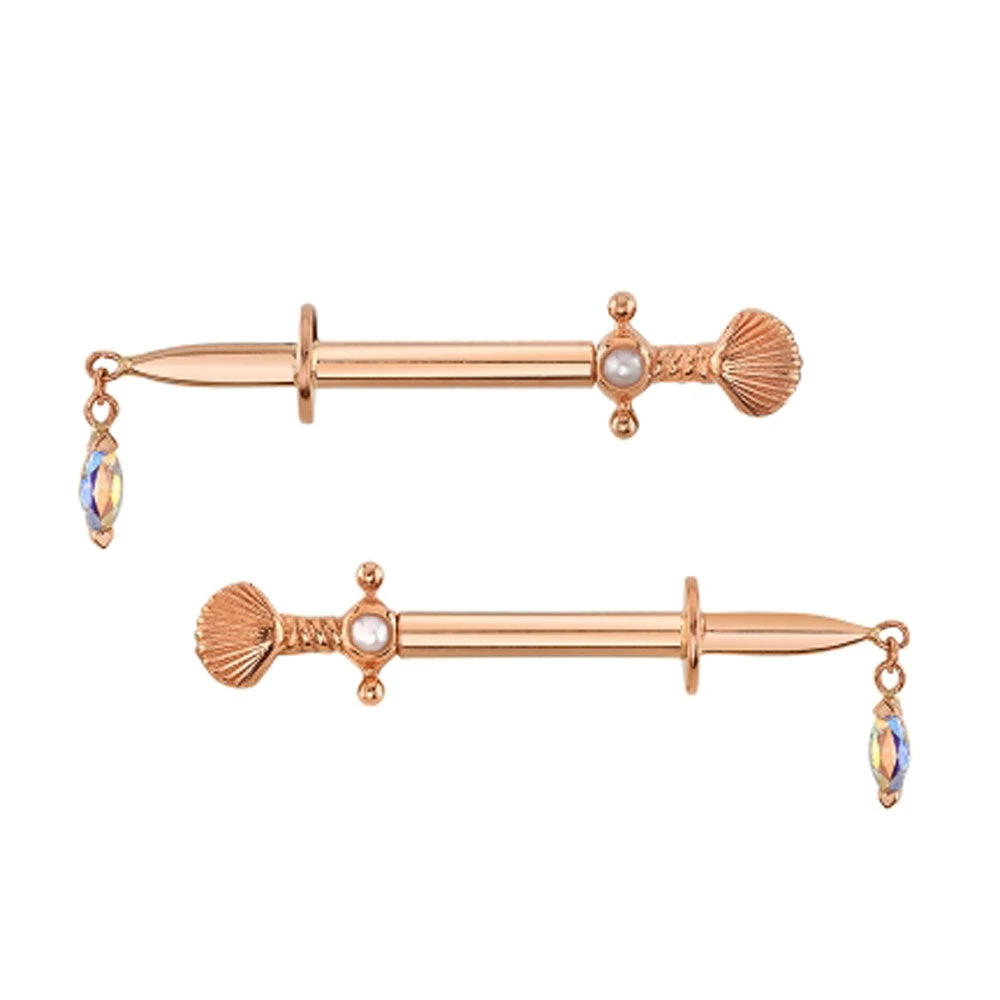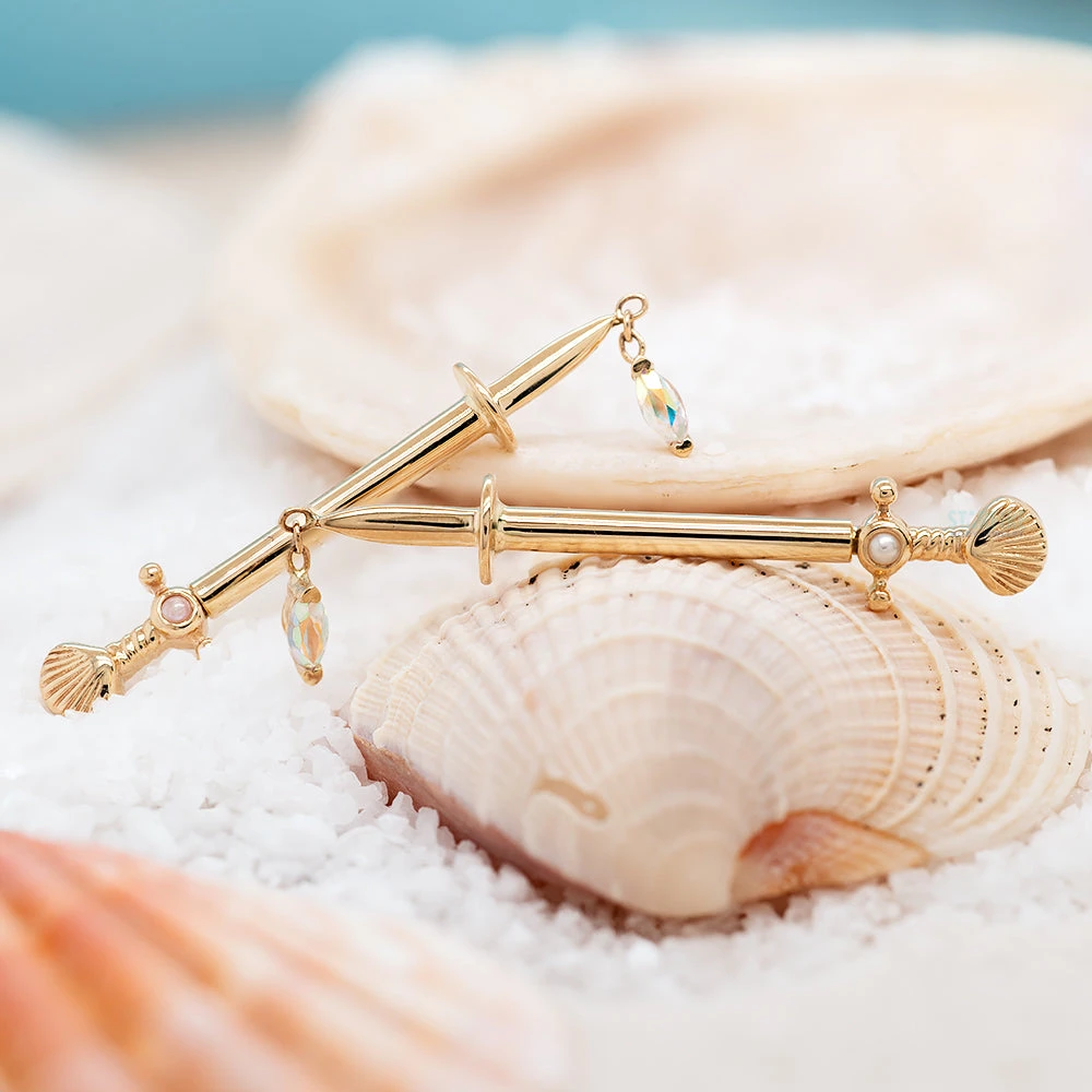 Calling all mermaids and mermen out there across the oceans and seas, because this one is for you. This set features a scallop seashell accented by a single gemstone in the hilt, alongside a dripping marquise gemstone at the end of the sword.