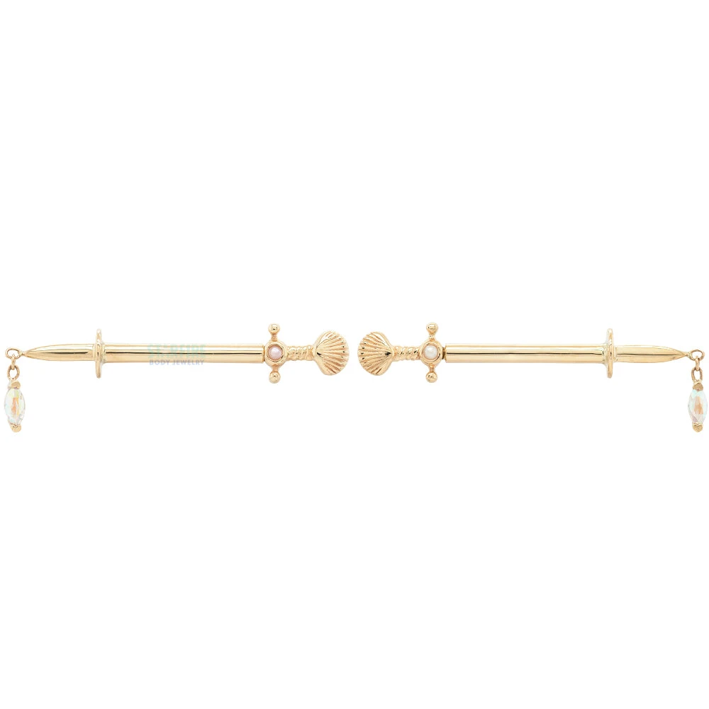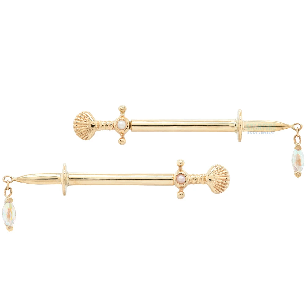 - Fixed blade end with (1) 3mm Scallop Seashell threaded end, (1) 1.25mm Round Pearl in hilt, and (1) 3mm x 1.5mm Marquise-Cut Mercury Mist Topaz dangle