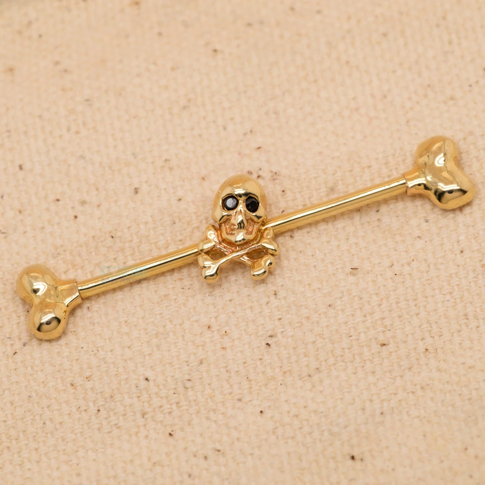 Calling all pirates out on the open sea looking for ye’ long lost treasure. This Skull & Crossbones Industrial Barbell makes the perfect accent for hitting the “x” marks the spot on your ear. It features a detailed jolly roger skull with black CZ’s for eyes and two bones for threaded ends.