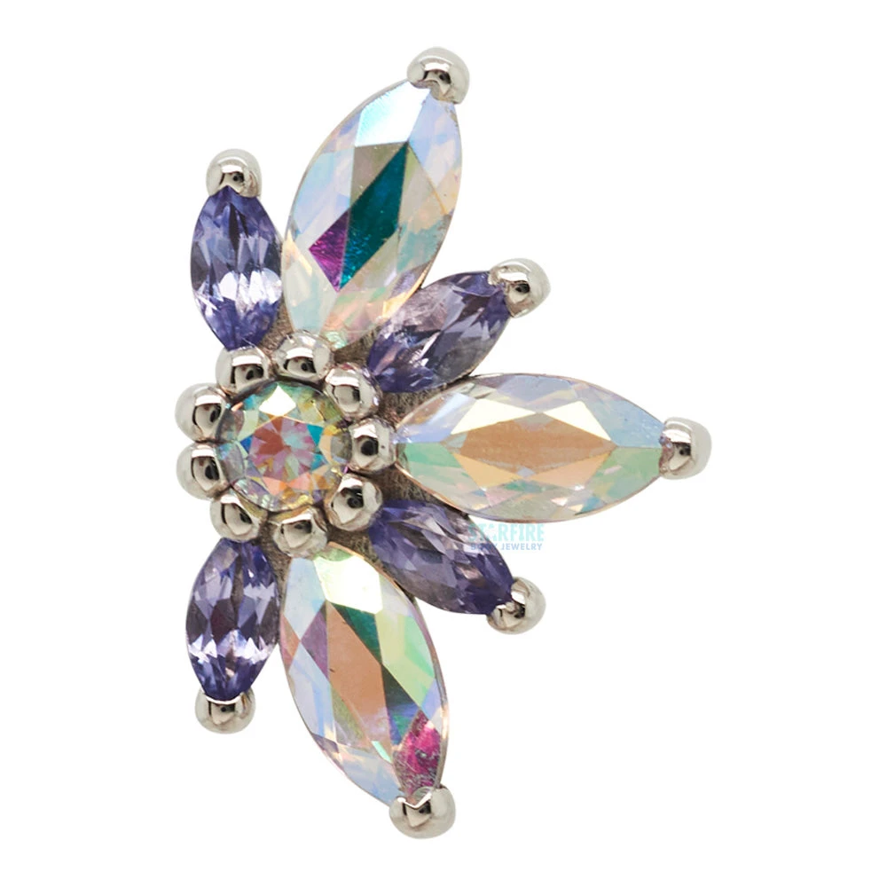 - Small: 11mm threaded end with (3) 4mm x 2mm Marquise-Cut Mercury Mist Topaz in Prong’s & (4) 2.5mm x 1.25mm Marquise-Cut Tanzanite A in Prong’s surrounding (1) 1.75mm Round Mercury Mist Topaz in Prong’s
