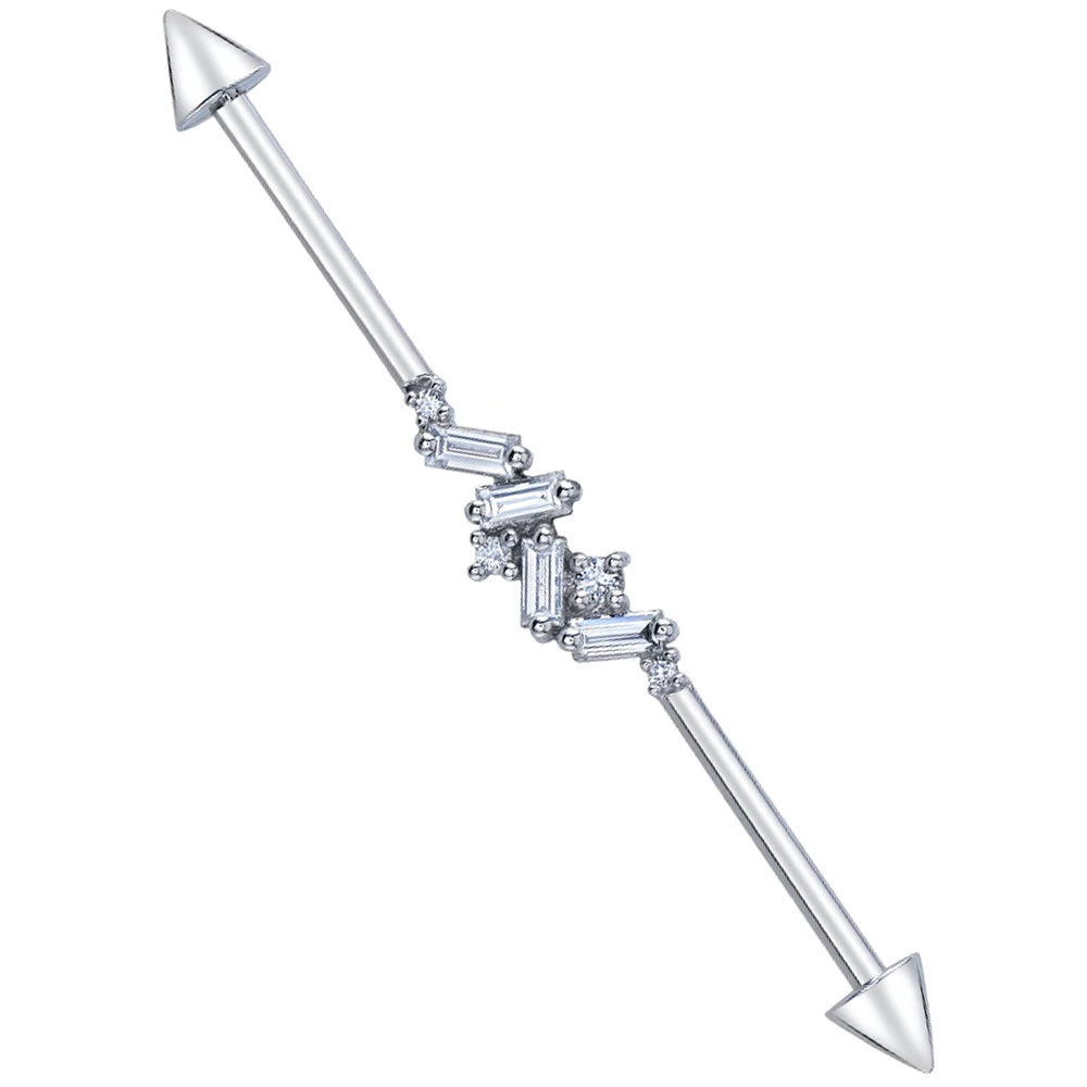 - 13.5mm x 4.5mm center with (4) 3mm x 1.5mm Straight Baguette Genuine White Diamonds, (1) 1.5mm Round Genuine White Diamond, (1) 1.25mm Genuine White Diamond, & (2) 1mm Round Genuine White Diamonds in Prong’s centered on barbell shaft with (2) 4mm threaded spike ends