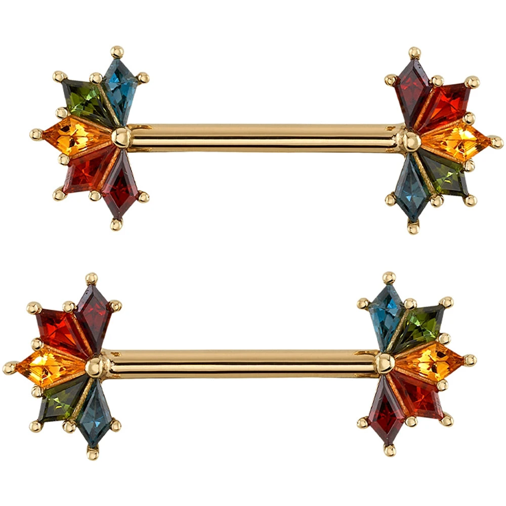 Show off your unique Spirit with these exquisite nipple barbells featuring vibrant clusters of rainbow gems.