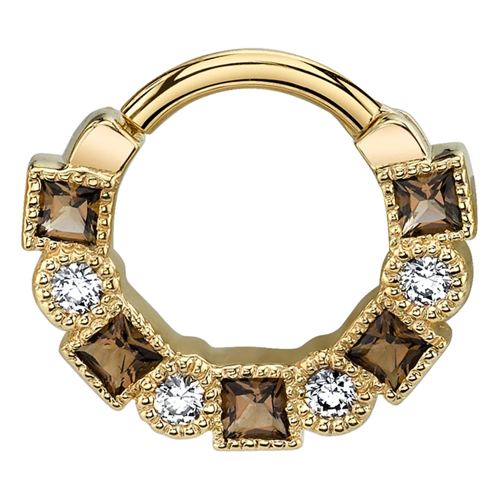 Mesmerizing princess cut Smoky Quartz and round Diamonds make this a stellar hinge ring!