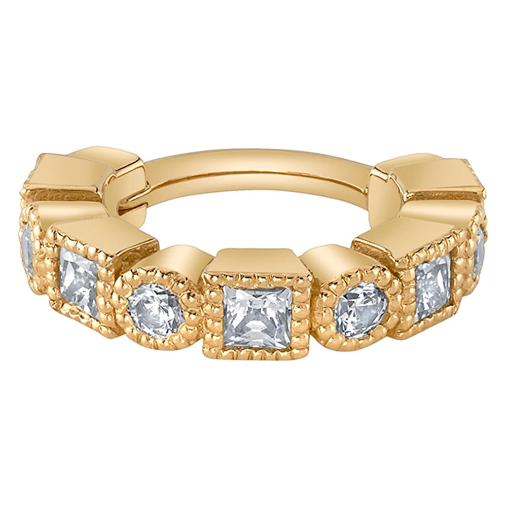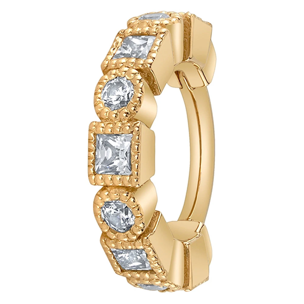 With a mix of princess cut and round gems, this hinge ring is sure to catch everyone’s eyes.