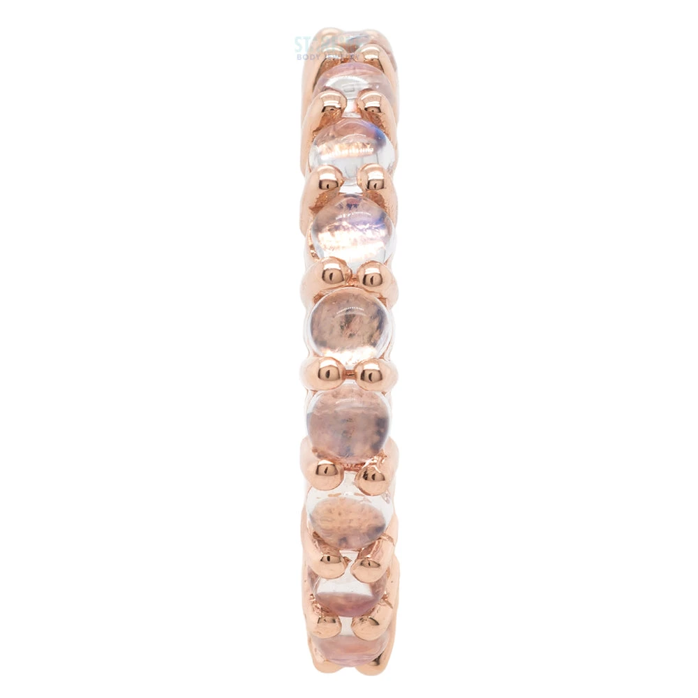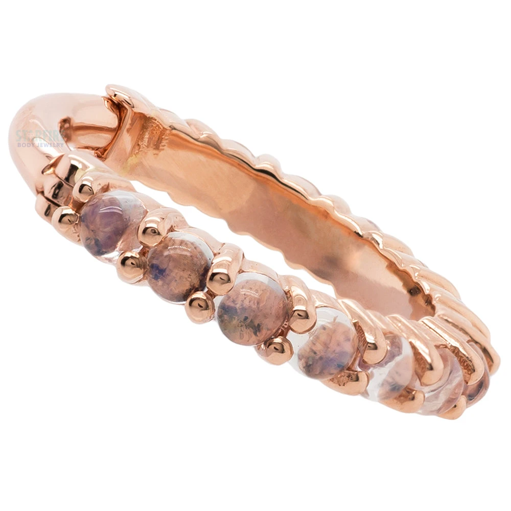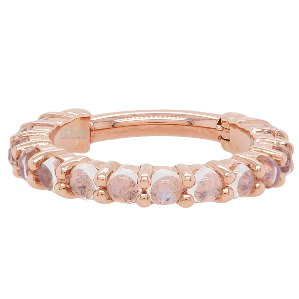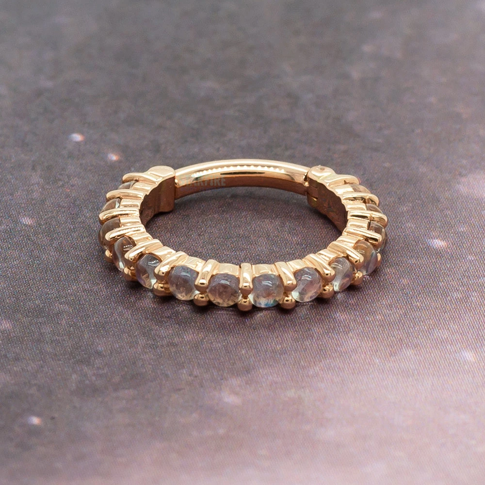 The Telesto Hinged Ring features a row of gems set in prongs wrapped around your piercing. The Rainbow Moonstone adds that elegant class we all look for.