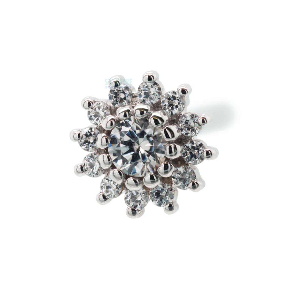 - 5mm end with (1) 2.5mm Round White CZ in Prong’s surrounded by (12) 1mm Round White CZ petals in Prong’s