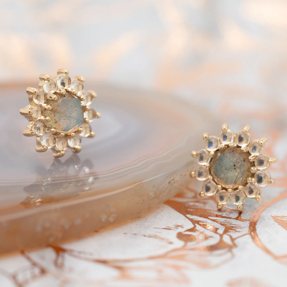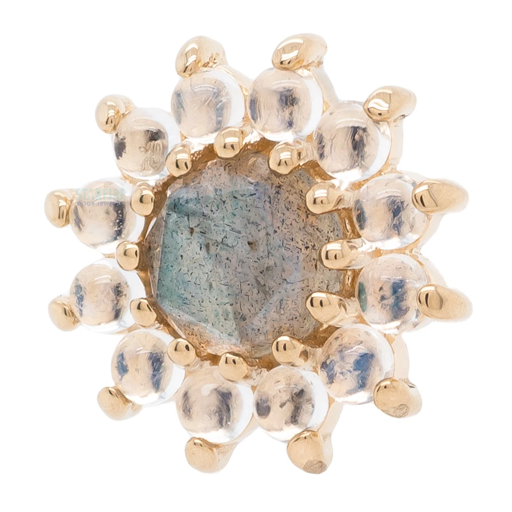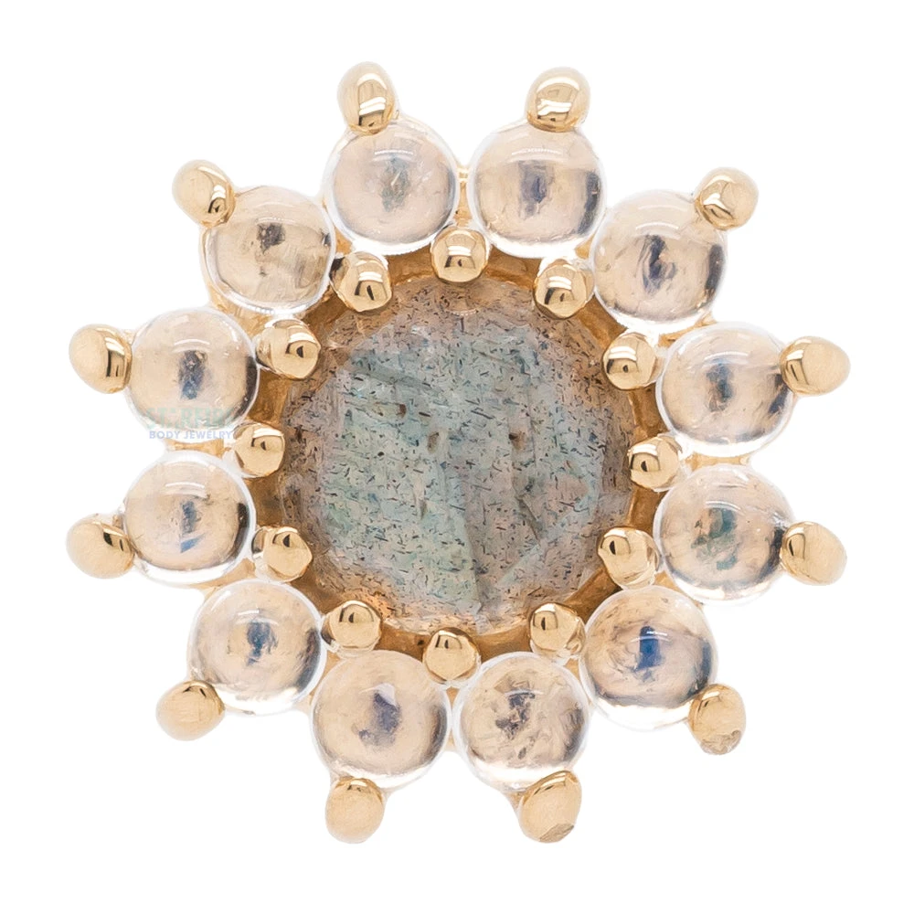 - 8mm threaded end with (1) 4mm Rose Cut Labradorite Cabochon in Prong’s surrounded by (12) 1.5mm Round Rainbow Moonstone in Prong’s