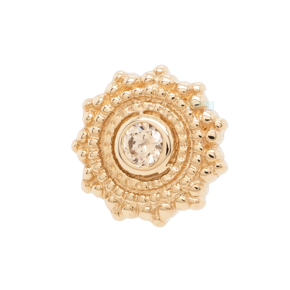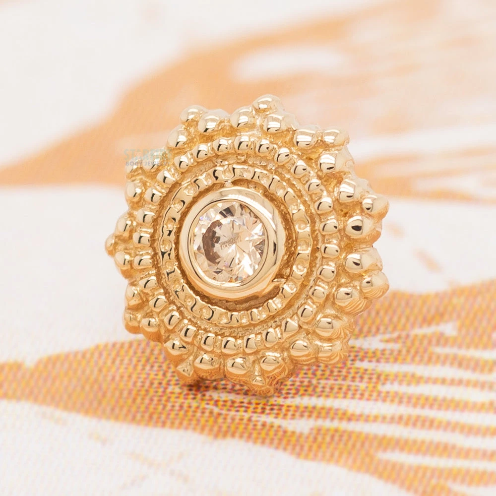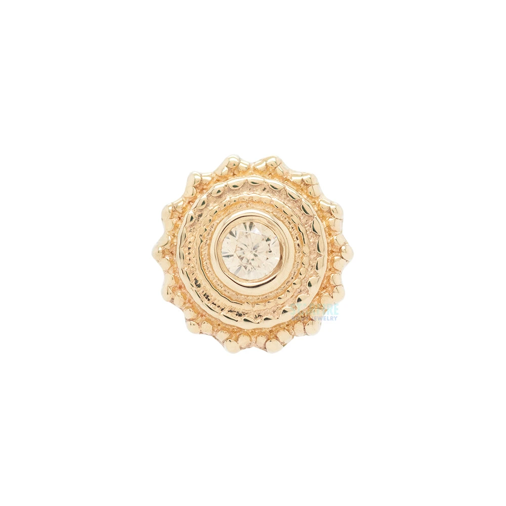 The Afghan threadless pin features a dazzling CZ nestled inside a bezel cup, surrounded by a detailed edging.