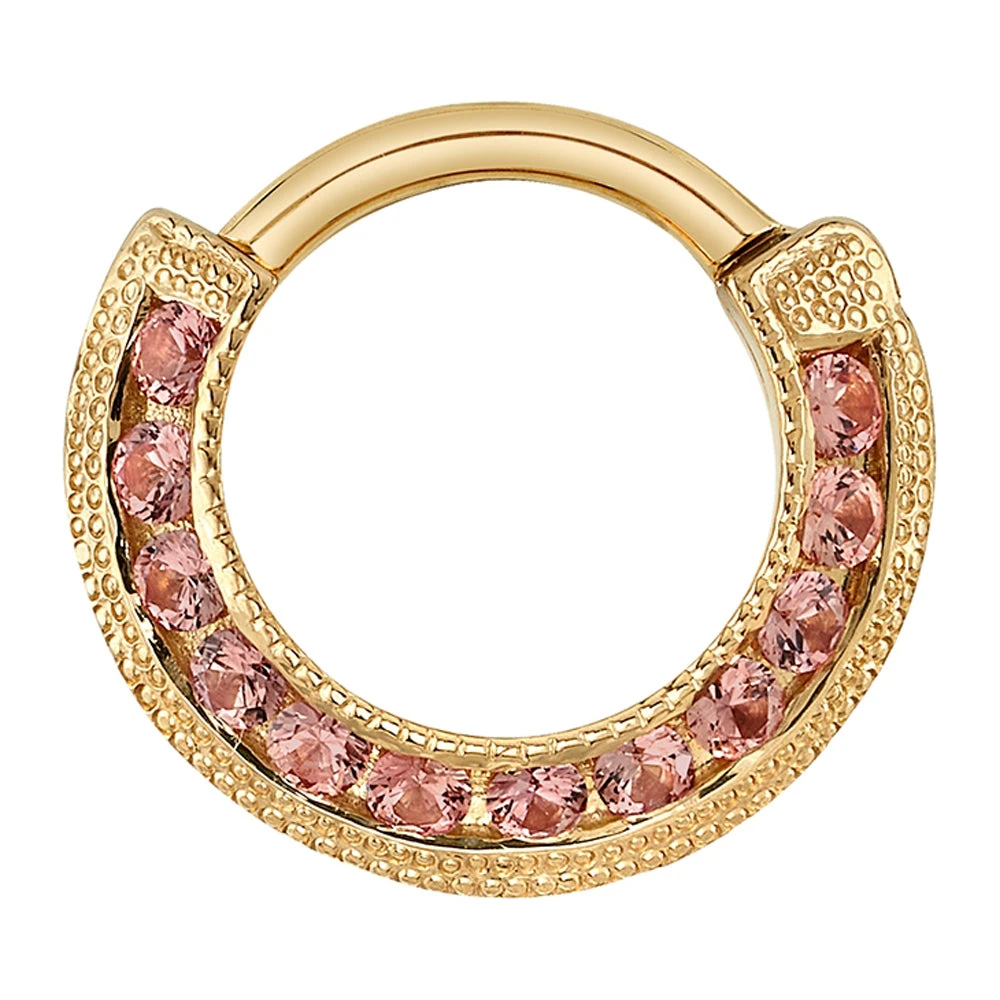 - Pave Texture Side: (12) 1.5mm Round Champagne Sapphires in Channel Setting