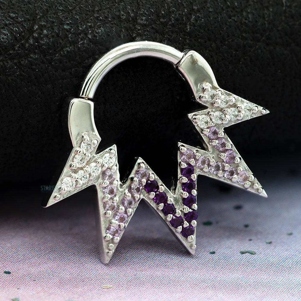 The razor-like angles makes it look as though the “Ziggy” bursts rays of spunk and fun. This piece features an ombre of purple hues.